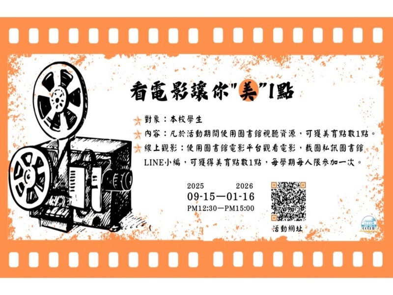 ➤ 凡於活動期間(  2025/09/15 - 2026/01/16  ),使用圖書館視聽資源,可獲美育點數1點。