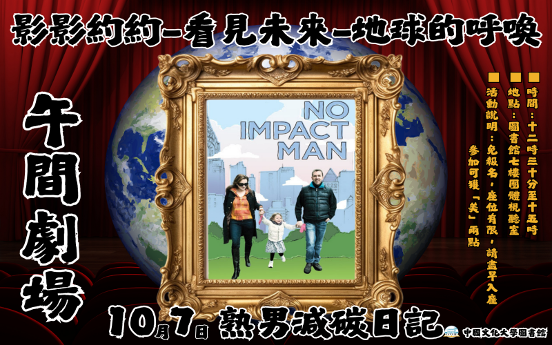 熟男減碳日記~主題影展 第1場:播映日期:114年10月07日 12:30-15:00 七樓團體視聽室 到場觀看影片同學可獲全人學習「美育點數2點」 熟男減碳日記 片長: 114分 演員: Colin Beavan Michelle Conlin 內容簡介: