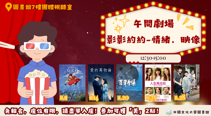 參加圖書館「午間劇場-影影約約」活動,到場觀看影片同學可獲全人學習「美育點數2點」,免報名,座位有限,請盡早入座!