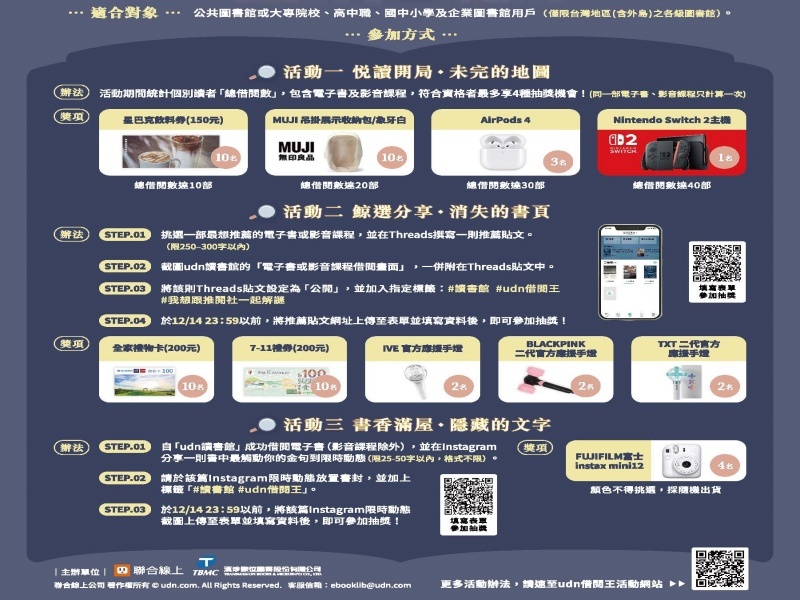 參加辦法:詳見活動網址:https://reading.udn.com/libnew/act/20251021/ 活動期間:即日起至2025/12/15 活動禮品:AirPods 4、Nintendo Switch 2主機、韓國偶像IVE官方應援手燈、BLACKPINK二代官方應援手燈、TXT官方應援手燈、星巴克飲料券、MUJI吊掛收納包、全家禮物卡及7-11禮券、FUJIFILM富士instax mini 12。