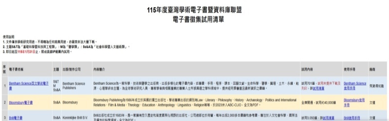 [試用] 臺灣學術電子書暨資料庫聯盟 115年電子書試用活動開始~