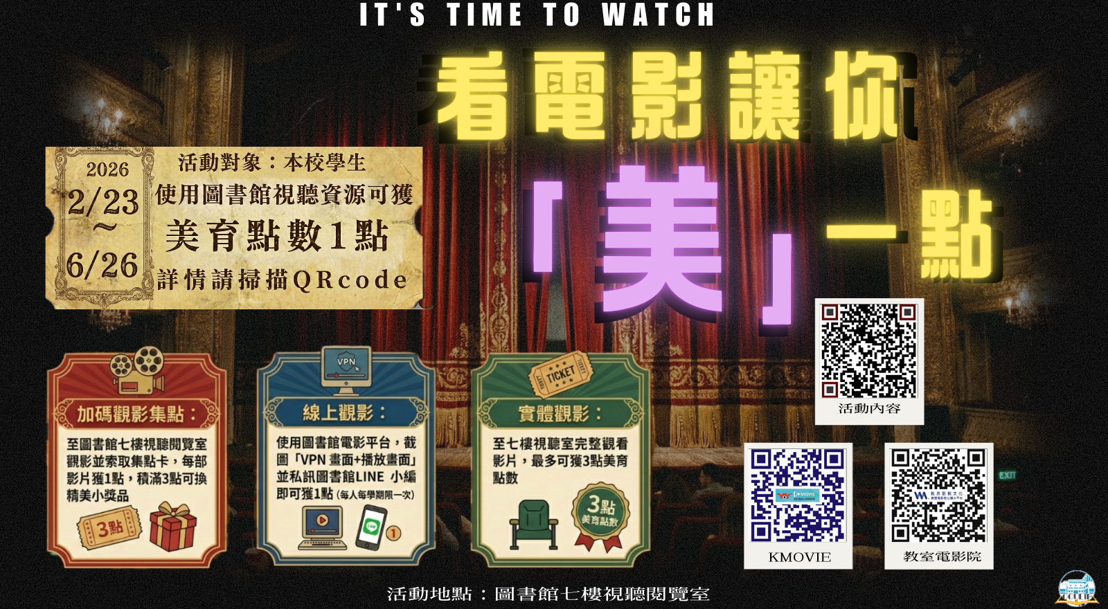1.線上觀影: 使用圖書館電影平台觀看電影,截圖私訊圖書館LINE小編,可獲得美育點數1點,每學期每人限參加一次。
